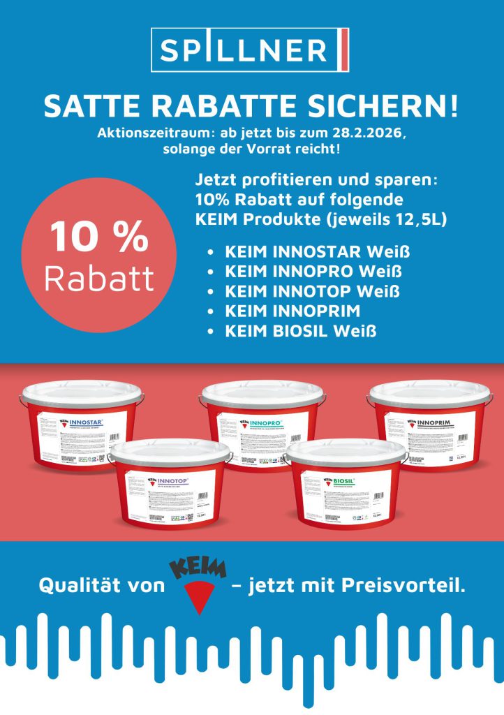 Sichern Sie sich jetzt unsere attraktive KEIM Farben Aktion in Kitzingen und profitieren Sie von 10 % Rabatt auf ausgewählte KEIM Qualitätsfarben im 12,5-Liter-Gebinde.