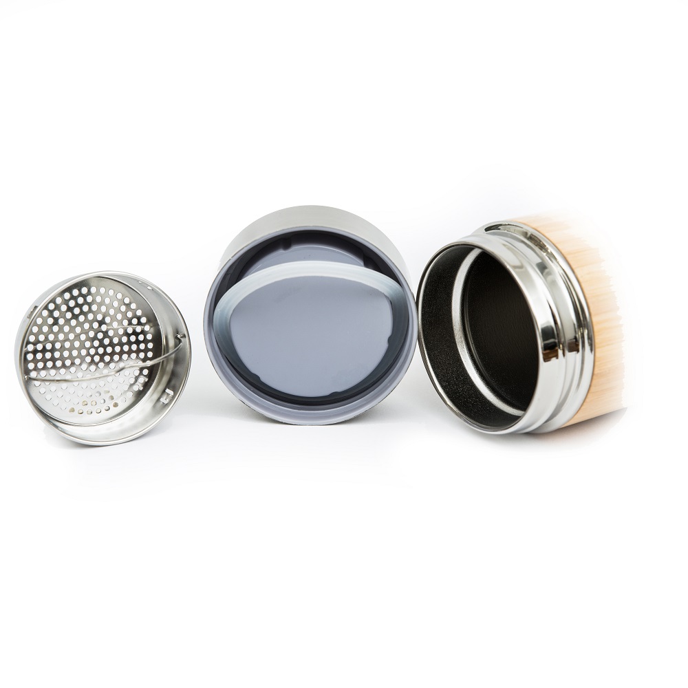 Vakuum isolierter Thermobecher inklusive Teesieb aus Edelstahl und Bambus. Für Heißgetränke im Winter oder kalte Erfrischungen im Sommer, der Becher hält die Temperatur bis zu 12 Stunden.