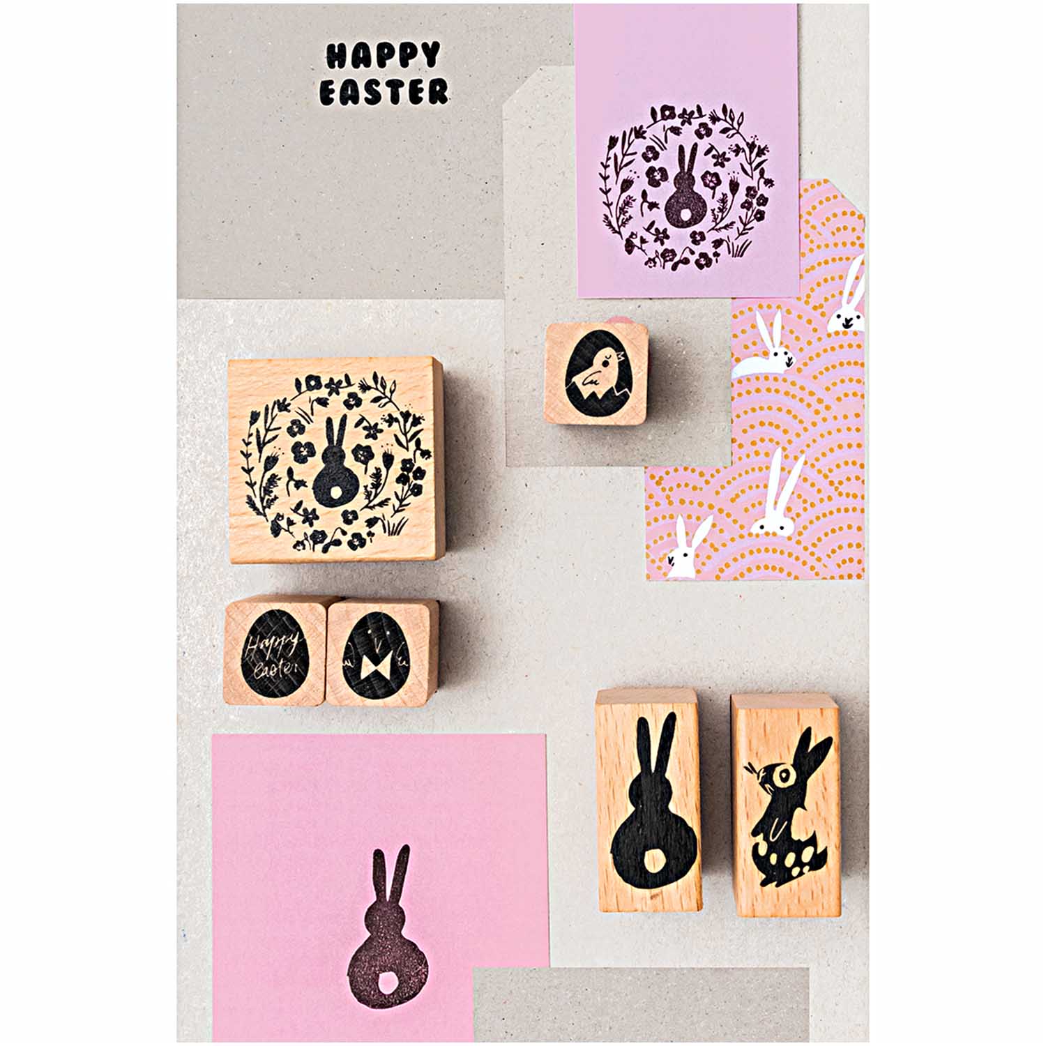 Die Themenwelt Bunny Hop begeistert mit pastellfarbenen Frühlingsdesigns. Leitmotive der Kollektion sind Hasen, Ostereier und Streublumen in Rosa-, Mint- und Gelbtönen. Die sowohl Erwachsene als auch Kinder ansprechenden Designs sind nicht ausschließlich österlich, sondern vor allem frühlingshaft. Mit den passenden Stempeln lassen sich kreative Gruß-, Einladungs- und Tischkarten für verschiedene Anlässe gestalten. Außerdem können Geschenkanhänger, Alben, Pappschachteln und vieles mehr bestempelt werden. Und damit man direkt loslegen kann, wird das erforderliche Tuschestempelkissen direkt mitgeliefert!