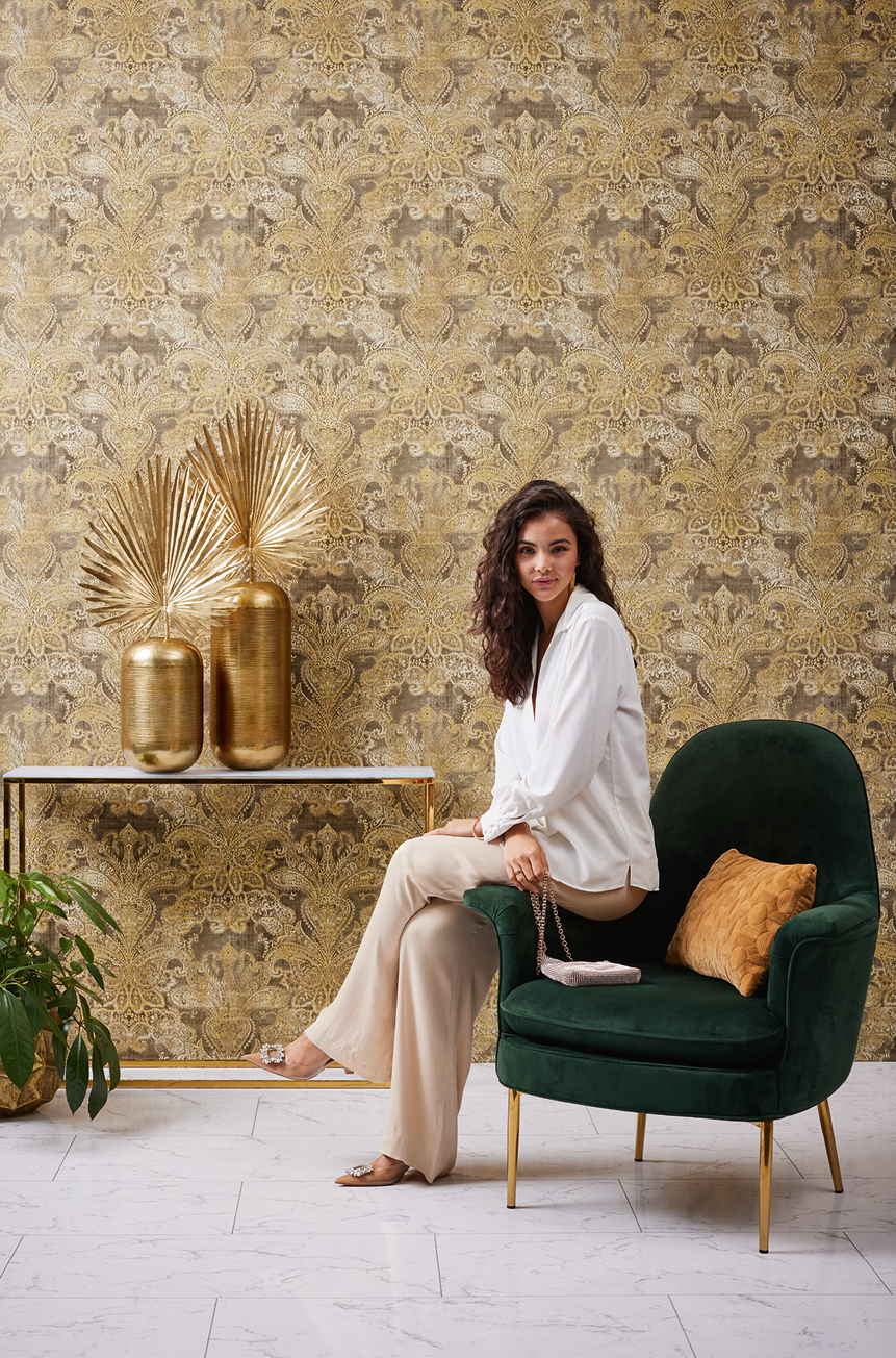 MAHA Dubai – Eine atemberaubende Reise in eine Metropole, in der Moderne auf Tradition trifft. Die Tapeten zeigen glanzvolle goldene Verzierungen und ornamentale Strukturen, die das Souvenir einer unvergesslichen Reise in die eigenen vier Wände bringen.
