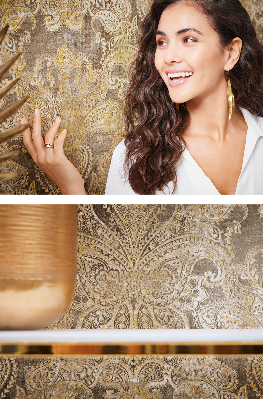 DAVID Vienna – Eine Reise in die Stadt der großen Denker und Künstler, in der Kunst, Kultur und klassische Eleganz den Ton angeben. Die Tapeten zeigen goldfarbene Ornamente in warmen Tönen, die einen spannenden Gegensatz zu geometrischen Strukturen bilden.